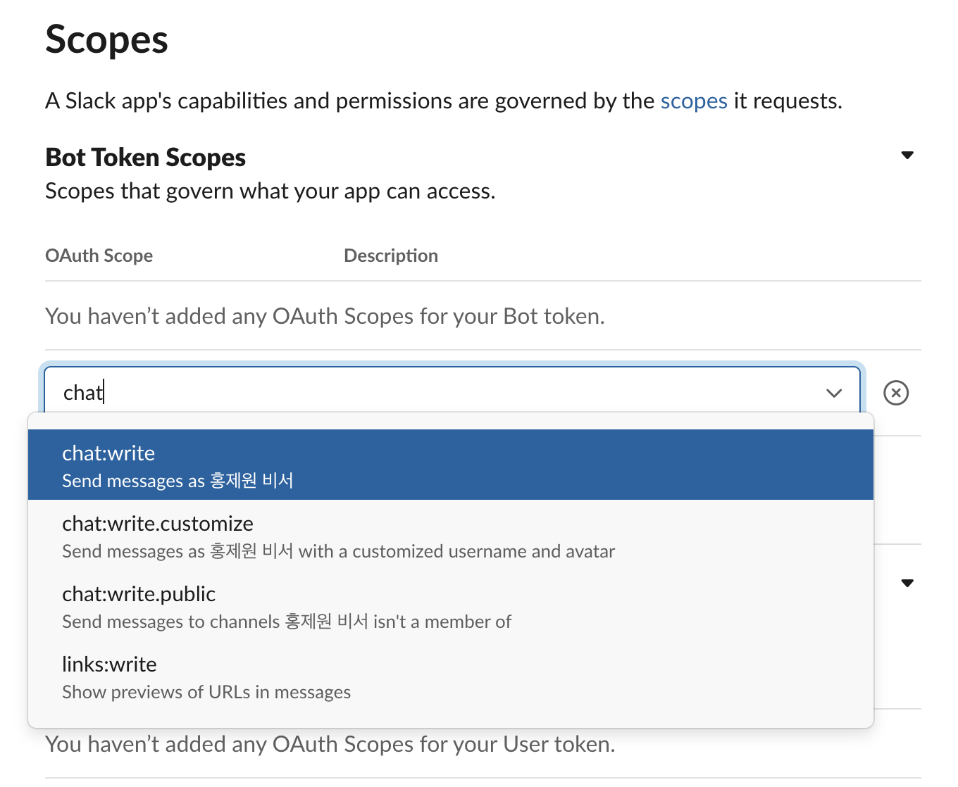 val methods: MethodsClient = Slack.getInstance().methods(token) // xoxb 로 시작하는 토큰 값을 입력