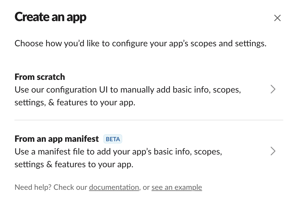- From an app manifest 의 경우 manifest 라는 구성 파일로 봇을 세팅 하는 방법이다.