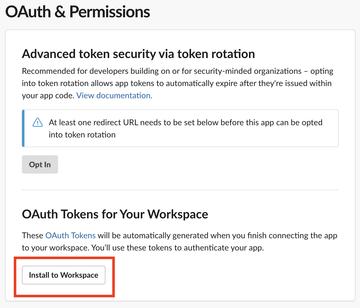 - Install to Workspace 클릭 전에 봇의 정보를 입력 해야 한다.